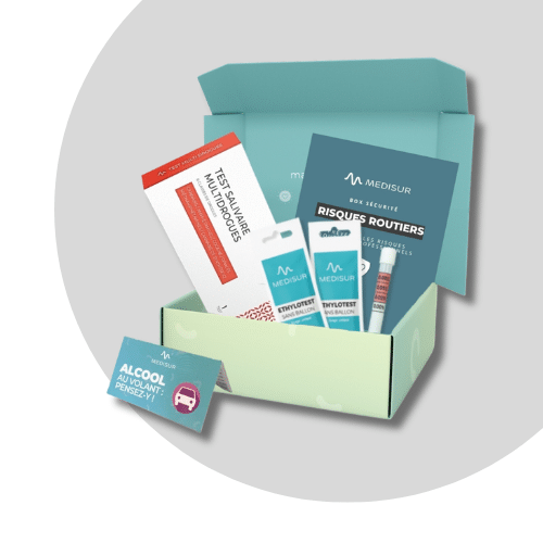 2 éthylotests Un autotest multidrogues salivaireRésultat en 10 minutes Un mémo SOS Un e-guide interactif sur les risques routiers professionnels30 minutes